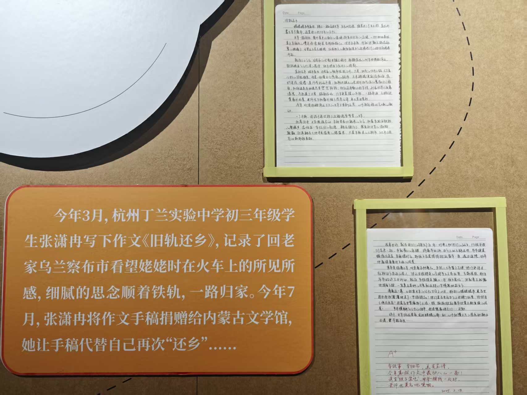 值得一提的是,憑借作文《舊軌還鄉(xiāng)》引起網(wǎng)友廣泛關(guān)注和共鳴的內(nèi)蒙古籍女孩張瀟冉,今年7月將手稿捐贈(zèng)給了內(nèi)蒙古文學(xué)館,本次展覽對《舊軌還鄉(xiāng)》手稿進(jìn)行展出。展覽還展出了生于2007年的少女詩人姜二嫚的詩作,年少成名的姜二嫚用7歲時(shí)所作的《光》向全國小詩人們送上問候。