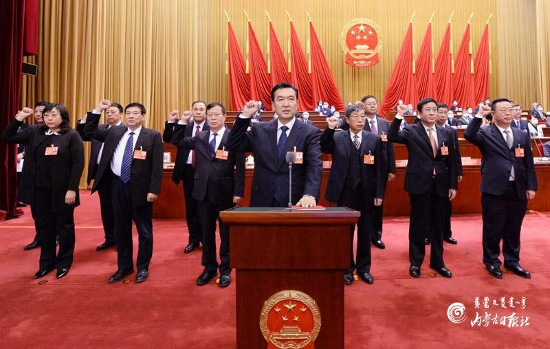1月30日上午,內(nèi)蒙古人民會(huì)堂國徽高懸,五星紅旗鮮艷奪目,自治區(qū)十三屆人大四次會(huì)議新當(dāng)選人員憲法宣誓儀式在這里舉行。