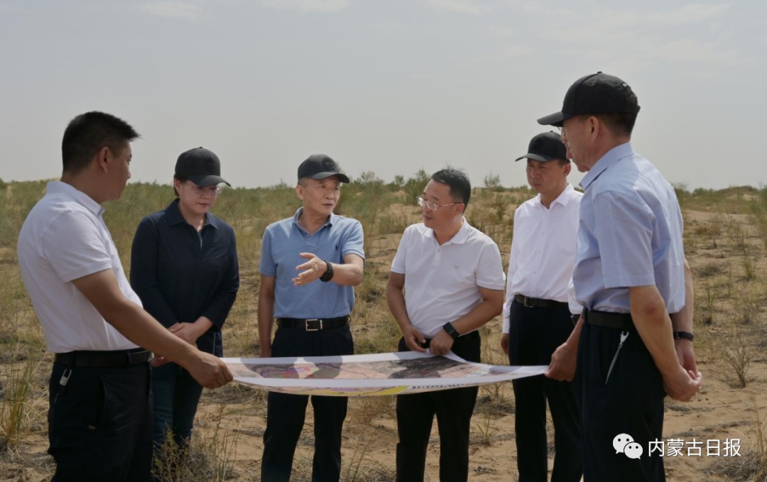 8月2日,自治區(qū)黨委書記孫紹騁在阿拉善左旗境內(nèi)的騰格里沙漠百萬畝花棒基地考察防風(fēng)固沙項目建設(shè)情況。記者馬建荃攝