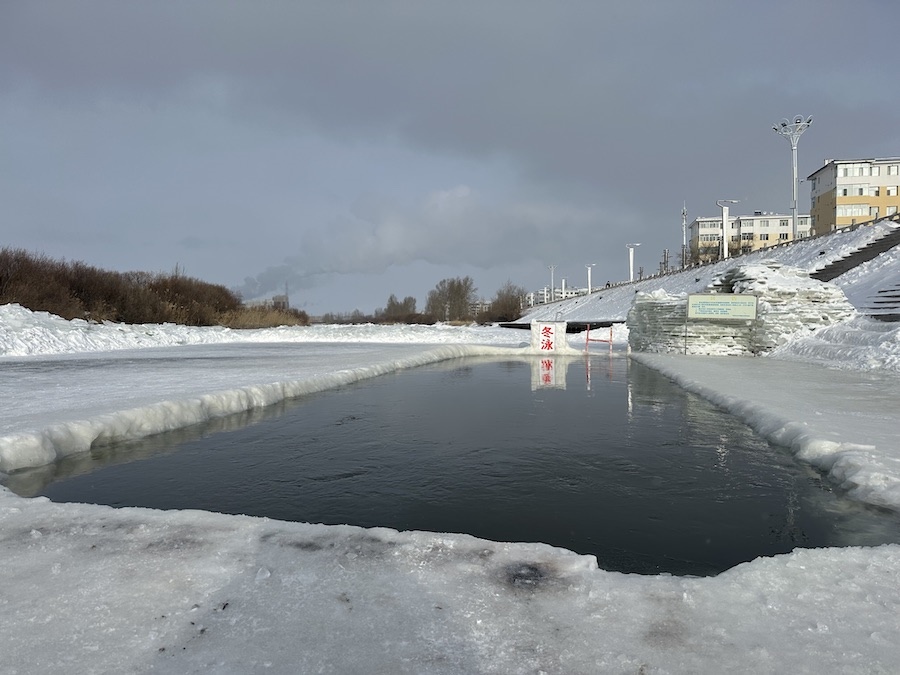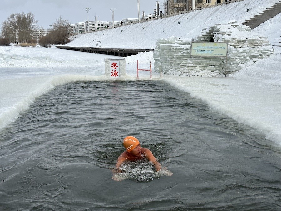 參加冬泳的協(xié)會(huì)成員只著泳衣,依次跳入在伊敏河冰面開鑿的冬泳池中,雖然天寒地凍,但是依然精神抖擻。