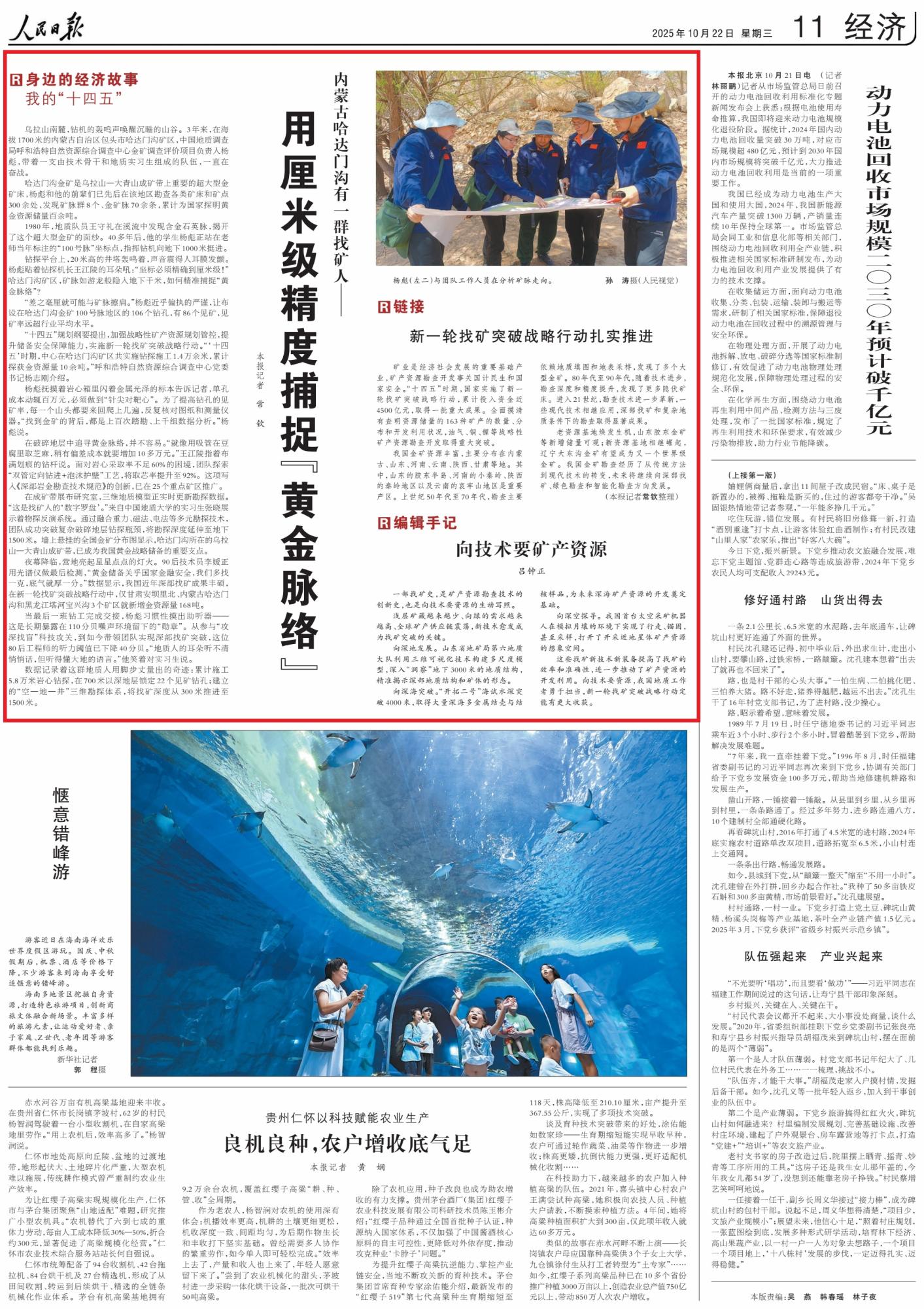 2025年10月22日,《人民日報》第11版刊發(fā)題為《內(nèi)蒙古哈達(dá)門溝有一群找礦人——用厘米級精度捕捉“黃金脈絡(luò)”》的文章,報道了中國地質(zhì)調(diào)查局楊彪團(tuán)隊在內(nèi)蒙古哈達(dá)門溝礦區(qū)奮戰(zhàn)3年,依托前輩基礎(chǔ),累計探明黃金百余噸,“十四五”期間新增10余噸,鉆孔見礦率超行業(yè)平均。