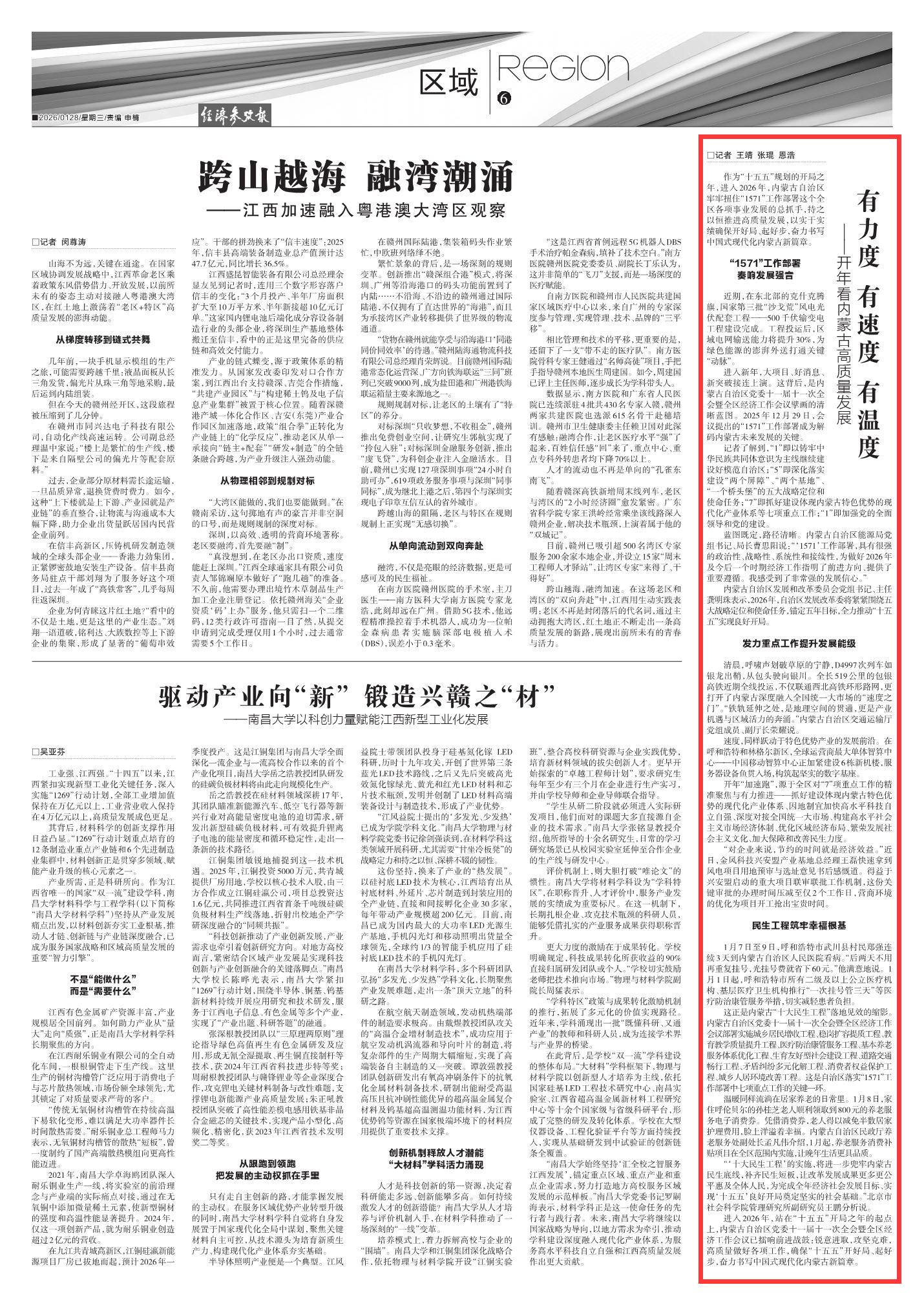 2026年1月28日《經(jīng)濟(jì)參考報(bào)》第6版刊發(fā)了《有力度 有速度 有溫度——開(kāi)年看內(nèi)蒙古高質(zhì)量發(fā)展》的文章,報(bào)道了進(jìn)入2026年,站在“十五五”開(kāi)局之年的起點(diǎn)上,內(nèi)蒙古自治區(qū)黨委十一屆十一次全會(huì)暨全區(qū)經(jīng)濟(jì)工作會(huì)議已擂響前進(jìn)戰(zhàn)鼓:銳意進(jìn)取,攻堅(jiān)克難,高質(zhì)量做好各項(xiàng)工作,確?!笆逦濉遍_(kāi)好局、起好步,奮力書(shū)寫(xiě)中國(guó)式現(xiàn)代化內(nèi)蒙古新篇章。