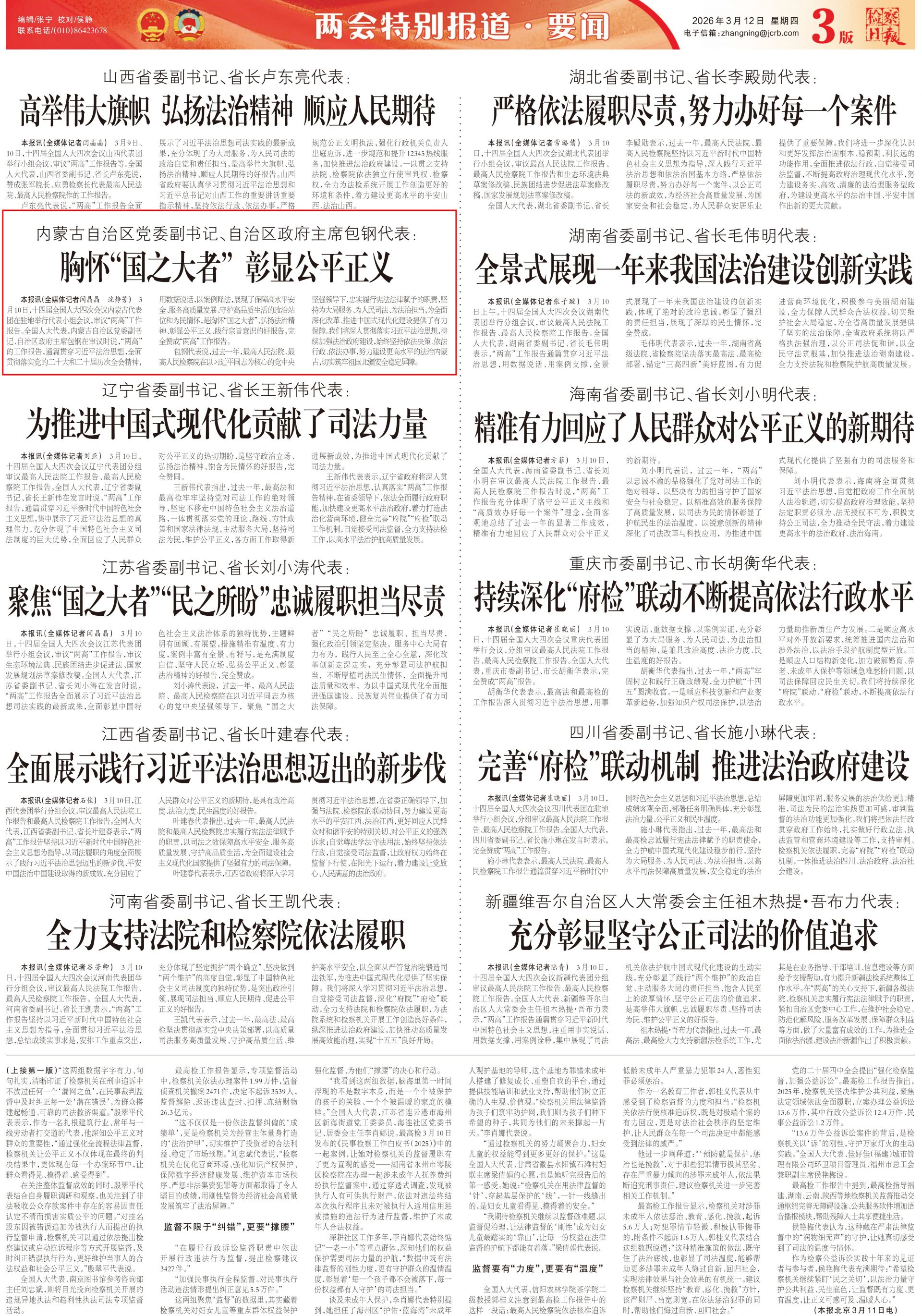 2026年3月11日《檢察日報》第3版刊發(fā)了《內(nèi)蒙古自治區(qū)黨委副書記、自治區(qū)政府主席包鋼代表: 胸懷“國之大者” 彰顯公平正義 》的文章,報道了十四屆全國人大四次會議內(nèi)蒙古代表團(tuán)在駐地舉行代表小組會議,審議“兩高”工作報告。全國人大代表,內(nèi)蒙古自治區(qū)黨委副書記、自治區(qū)政府主席包鋼在審議時說,“兩高”的工作報告,通篇貫穿習(xí)近平法治思想,全面貫徹落實黨的二十大和二十屆歷次全會精神,用數(shù)據(jù)說話,以案例釋法,展現(xiàn)了保障高水平安全、服務(wù)高質(zhì)量發(fā)展、守護(hù)高品質(zhì)生活的政治站位和為民情懷,是胸懷“國之大者”、弘揚法治精神、彰顯公平正義、踐行宗旨意識的好報告,完全贊成“兩高”工作報告。