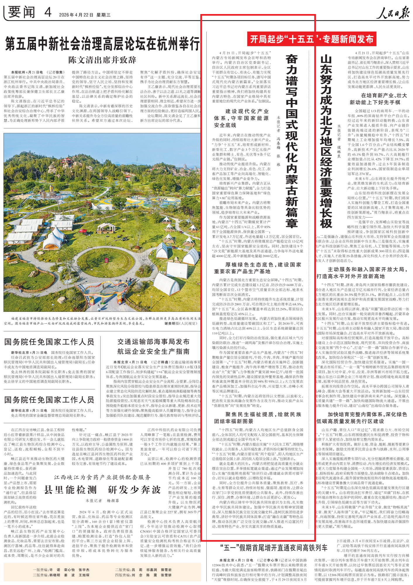 2026年4月22日,《人民日報(bào)》第4版刊發(fā)題為《奮力譜寫中國式現(xiàn)代化內(nèi)蒙古新篇章》的文章,報(bào)道了4月21日,開局起步“十五五”內(nèi)蒙古專場新聞發(fā)布會在呼和浩特舉行。