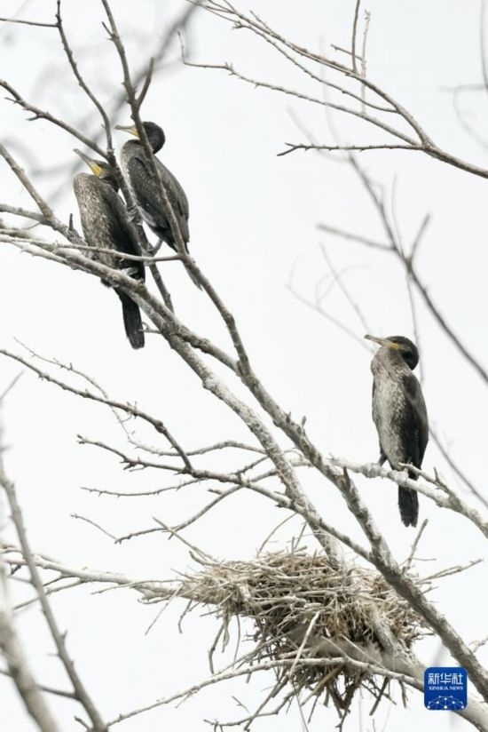 準備學習飛翔的幾只鸕鶿幼鳥棲息在密云水庫“鳥島”的樹上(5月31日攝)。