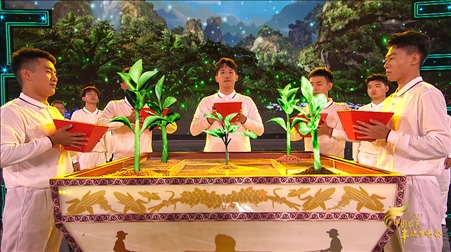 民以食為天,食以糧為先。2023年豐晚現(xiàn)場,沿著五條金穗鋪展的“豐收大道”,五位育種專家將手捧五斗種子,把自主創(chuàng)新培育的棉花、小麥、玉米、花生、水稻種子,鄭重交給自己的學(xué)生,并和一批農(nóng)科大學(xué)新生代表共同完成一場別有深意的“中國種子傳承儀式”。種子最終被播入“五色土”,不僅種下代代傳承、年年豐收的美好心愿,更承載著一代又一代科研工作者不斷求索與接力、守護(hù)糧食安全的責(zé)任和使命。
