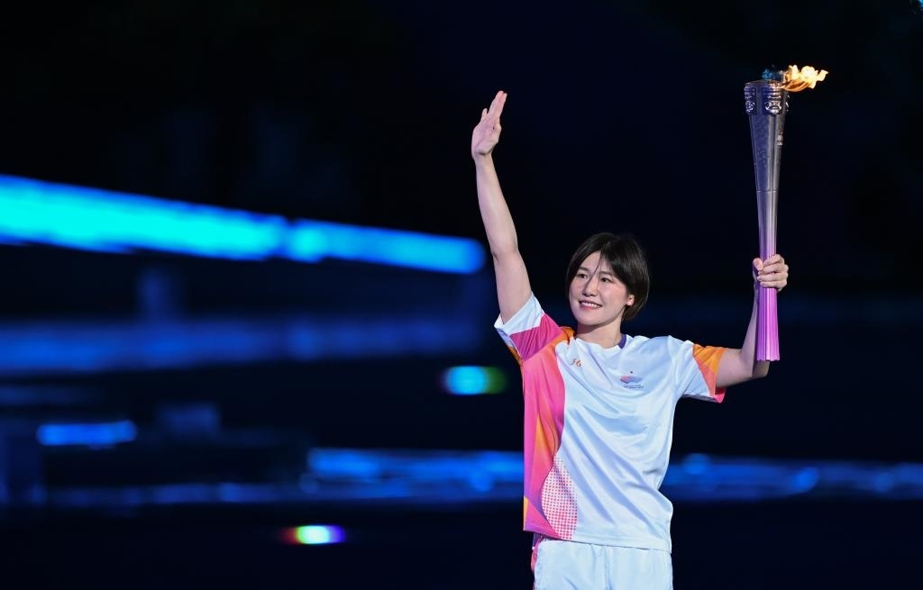 9月23日,火炬手葉詩文在開幕式上進(jìn)行火炬?zhèn)鬟f。新華社記者 李一博 攝