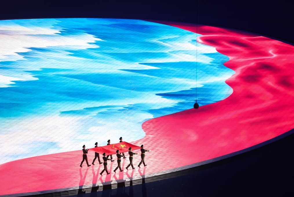地屏上,一幅紅綢飛掠壯麗河山。8名儀仗兵步伐鏗鏘,護(hù)旗入場?!拔覑勰阒袊覑勰愦禾炫畈难砻纭眲尤说馁澑枭钋槌?。