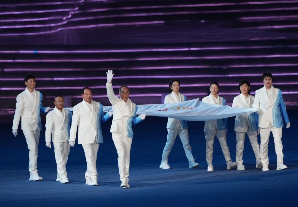 音樂響起,8名中國運(yùn)動員、教練員代表共執(zhí)亞奧理事會會旗入場。伴隨著亞奧理事會會歌,會旗緩緩上升,在杭州高高飄揚(yáng)。