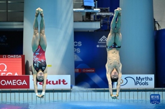7月18日,中國選手掌敏潔(左)/白鈺鳴在混合十米臺比賽中。