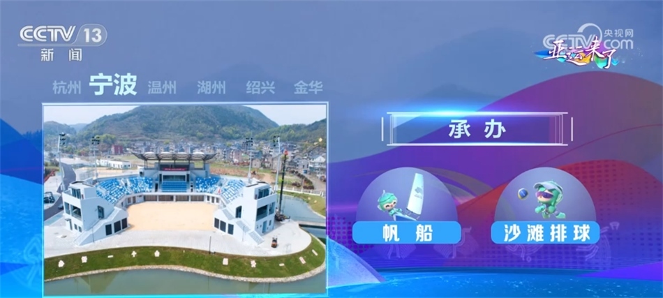 寧波設(shè)2個場館和1個亞運分村,承辦帆船和沙灘排球項目;溫州設(shè)3個場館和1個亞運分村,承辦足球小組賽和龍舟項目;湖州設(shè)2個競賽場館,承辦排球和三人制籃球項目;紹興設(shè)4個場館,承辦籃球、排球、攀巖、棒壘球項目;金華設(shè)3個場館和1個亞運分村,承辦足球小組賽和藤球項目。