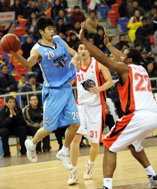 2009年1月21日,代表北京金隅隊(duì)的方碩(左)在CBA聯(lián)賽中分球。新華社記者藺以光攝