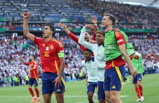7月5日,西班牙隊球員賽后慶祝比賽勝利。新華社記者 白雪飛 攝