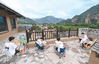 在位于山西省左權(quán)縣澤城村的中國(guó)北方國(guó)際寫(xiě)生基地澤城驛站內(nèi),山西工學(xué)院的學(xué)生們?cè)诋?huà)畫(huà)。新華社記者 楊晨光攝