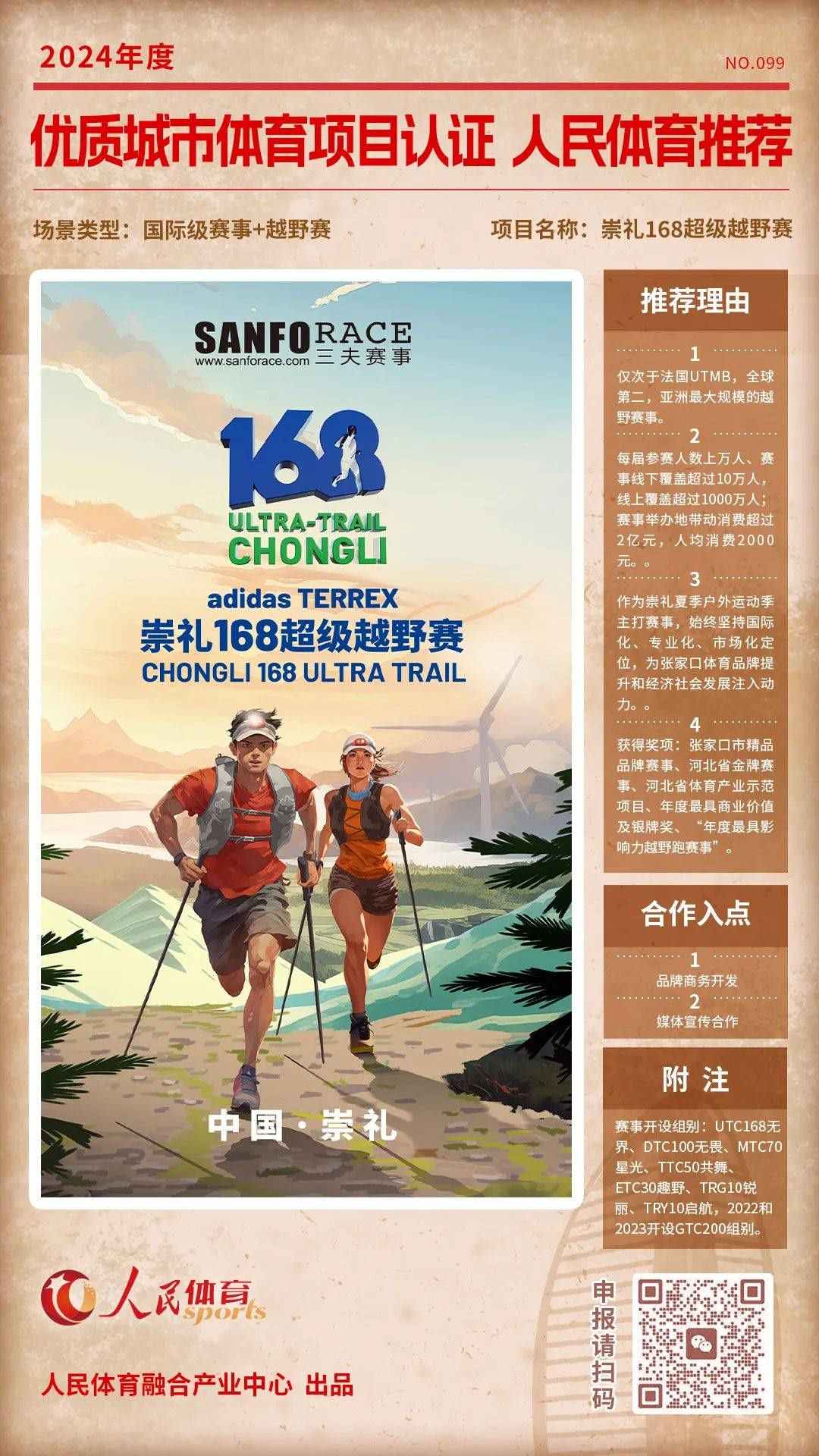 “優(yōu)質(zhì)體育賽事及活動(dòng)認(rèn)證推薦計(jì)劃”是人民體育“城市體育產(chǎn)業(yè)高質(zhì)量發(fā)展計(jì)劃”的重要組成部分,人民體育一直致力于攜手權(quán)威機(jī)構(gòu)、組織單位等聯(lián)合推薦優(yōu)質(zhì)項(xiàng)目,項(xiàng)目類型包括且不限于賽事、活動(dòng),也涵蓋產(chǎn)品與服務(wù)類別。旨在以更客觀的角度,展示在體育產(chǎn)業(yè)發(fā)展中有所創(chuàng)新,有所價(jià)值的項(xiàng)目,促進(jìn)多方相互了解,融合發(fā)展。