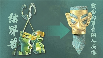 “卷鼻子”結(jié)界獸造型除了融合戴金面罩青銅人頭像、青銅大面具的元素外,還借鑒青銅縱目面具、三星堆青銅鷹形鈴的特點(diǎn)。
