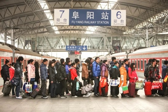 元宵節(jié)剛過(guò),返程旅客在阜陽(yáng)站排隊(duì)等候上車(chē)。