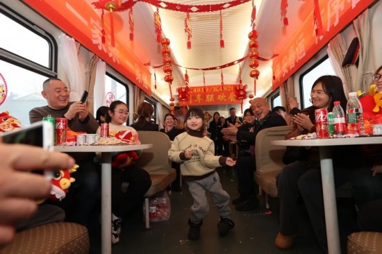 2月4日,臨客列車(chē)上的客運(yùn)員與旅客一起聯(lián)歡。