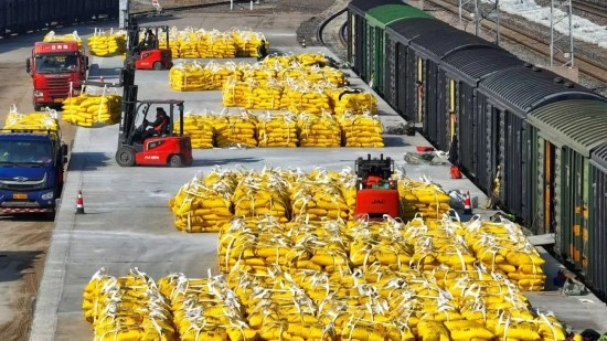 2月11日,石家莊鐵路物流中心辛集營(yíng)業(yè)部晉州貨場(chǎng)內(nèi),一袋袋化肥從棚車(chē)卸下,準(zhǔn)備運(yùn)往田間地頭。