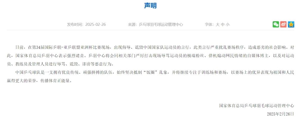 日前,在第34屆國際乒聯(lián)-亞乒聯(lián)盟亞洲杯比賽現(xiàn)場,出現(xiàn)侮辱、詆毀中國國家隊運動員的言行,此類言行嚴(yán)重擾亂賽場秩序,造成惡劣的社會影響。