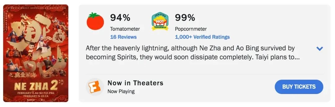 不僅打破了多項(xiàng)票房紀(jì)錄,《哪吒2》更以IMDb評(píng)分8.2分、爛番茄新鮮度94%、爆米花指數(shù)99%的口碑,讓世界看見中國電影的工業(yè)實(shí)力與文化魅力。