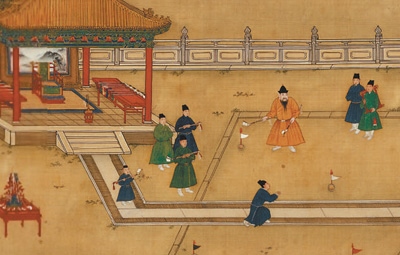 捶丸對場地要求不高,在一塊郊野地或自家庭院,挖幾個球窩,插上標志,便是一塊臨時球場。比賽時球員在各自確定區(qū)域開球,輪流擊球,每成功擊球入窩便可得一籌,比賽結束時籌數(shù)更多者獲勝。