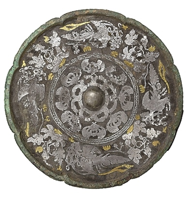 河南洛陽博物館展陳的唐代金銀平脫花鳥紋銅鏡。