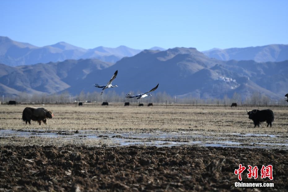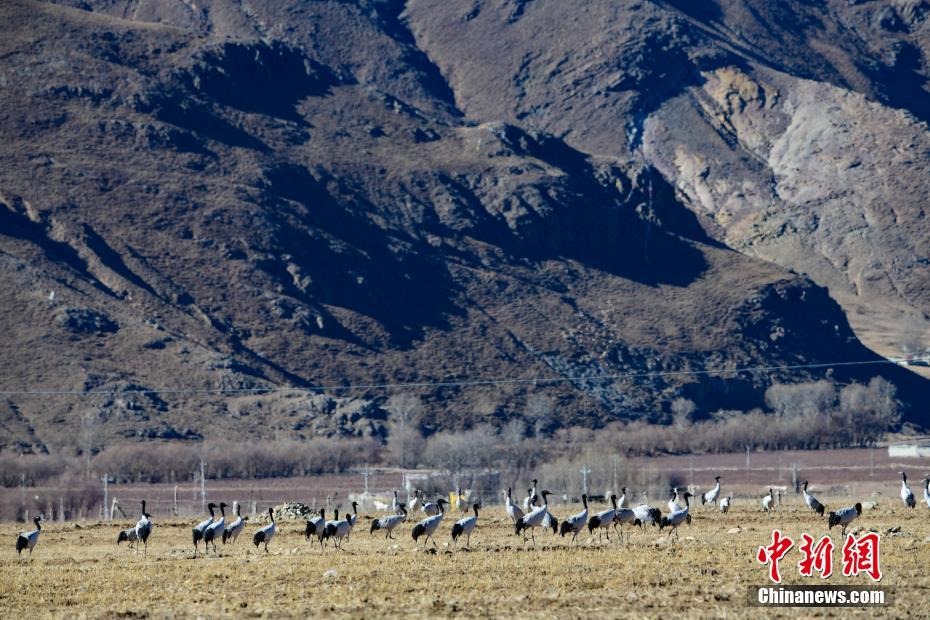 12月20日,黑頸鶴在西藏拉薩市林周縣虎頭山水庫周邊的冬灌地里棲息。嚴(yán)冬時(shí)節(jié),拉薩河谷沿線的草甸、山巒、候鳥、寺廟構(gòu)成一道獨(dú)特的風(fēng)景線。 中新社記者 貢嘎來松 攝