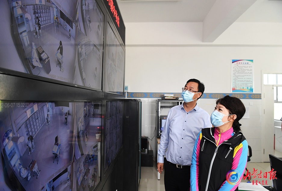 6月7日,王莉霞在二連浩特市蒙古族中學(xué)通過(guò)視頻監(jiān)控查看學(xué)生高考實(shí)時(shí)畫面,詳細(xì)了解考點(diǎn)疫情防控部署。內(nèi)蒙古日?qǐng)?bào)社融媒體記者韓卿立攝