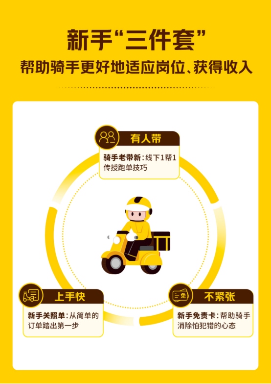 為了幫助新騎手循序漸進(jìn)地提升配送技能,更好地獲得收入,7月14日,美團(tuán)配送推出新手“三件套”,包括一對(duì)一傳幫帶的“騎手老帶新”,優(yōu)先分配難度較低的“新手關(guān)照單”,以及提供額外免責(zé)機(jī)會(huì)的“新手免責(zé)卡”。調(diào)研數(shù)據(jù)顯示,新手“三件套”推出后,新騎手滿意度提升了13.5%。