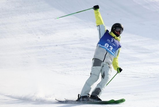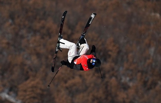 2月17日,內(nèi)蒙古隊(duì)選手楊昊在比賽中慶祝,他以174.75分的成績獲得冠軍。新華社記者 王楷焱 攝