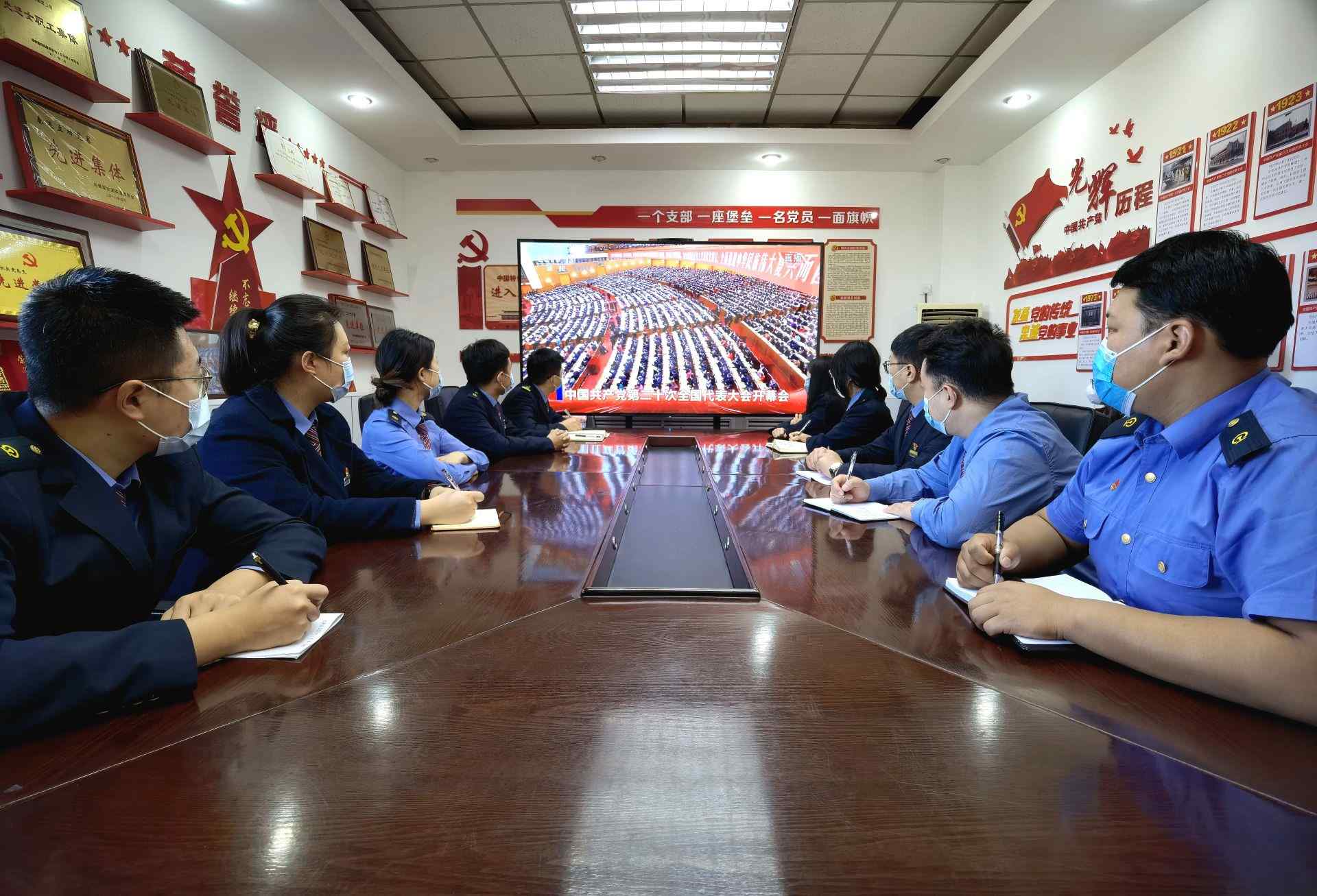 二連出入境邊防檢查站民警收看黨的二十大開幕會。郭鵬杰攝