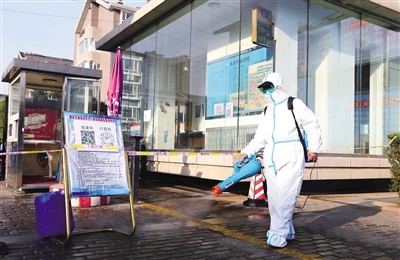 在萬(wàn)錦·領(lǐng)秀小區(qū)門口,城管工作人員在警戒線內(nèi)正在消殺市民給小區(qū)居民送來的物品。“小區(qū)目前處于封閉狀態(tài),小區(qū)內(nèi)有蔬菜超市,可以滿足市民的正常餐食問題。目前還有一些市民也會(huì)給小區(qū)居民送來一些日常用品,我們會(huì)把這些物品消殺后送進(jìn)小區(qū)?!毙^(qū)門口的工作人員說。