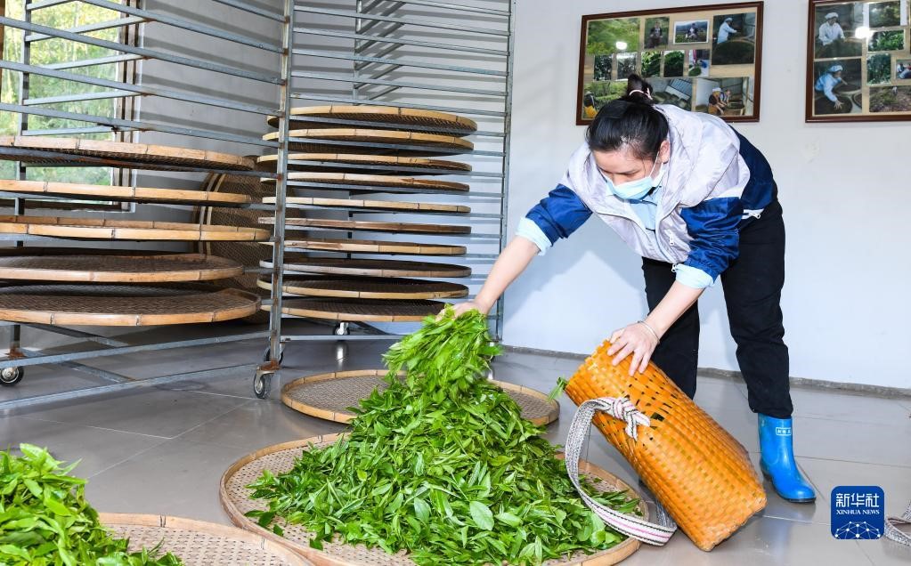 4月10日,在海南省五指山市水滿鄉(xiāng)毛納村,茶農(nóng)在手工茶坊內(nèi)工作。新華社記者 楊冠宇 攝